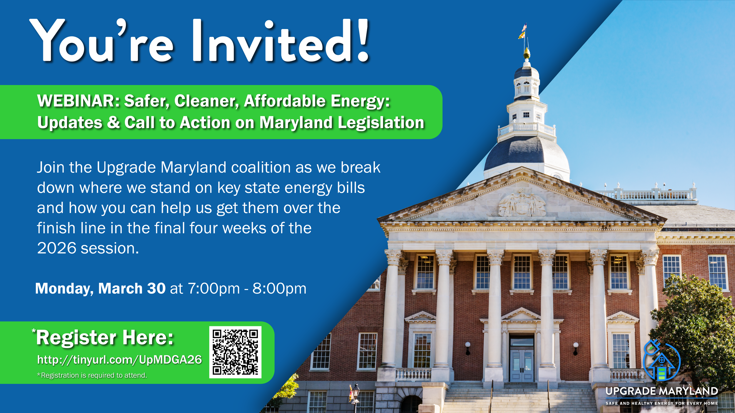 Join the Upgrade Maryland coalition on Monday, March 30, 2026, 7 p.m., as we break down where we stand on key state energy bills and how you can help us get them over the finish line in the final four weeks of the 2026 session. Sign up below.